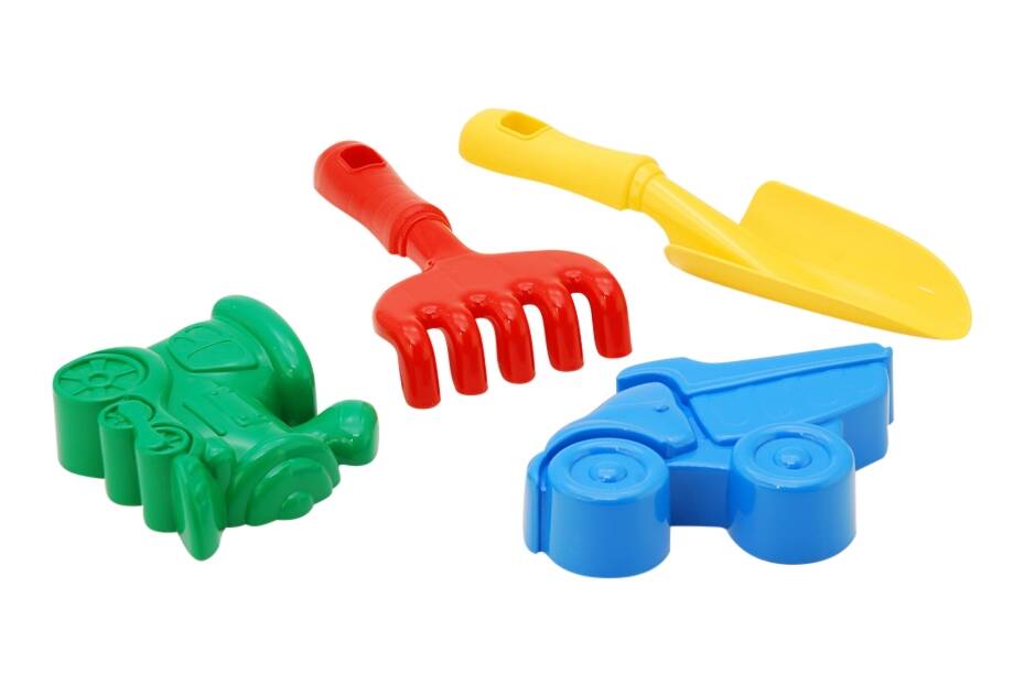 Песочный набор "Кувшинка" №4, лопатка, грабельки, три пасочки, в сетке 15*10см, Украина, ТМ Колорпласт (48шт)