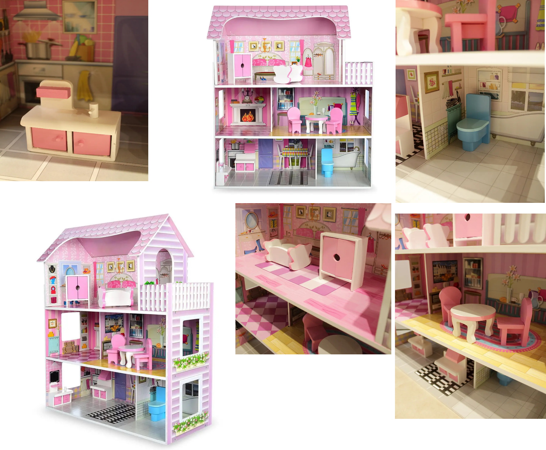 Деревянный домик для куклы — игрушечный дом с тремя этажами, пятью комнатами и балконом, укомплектованный мебелью для любимых кукол. В домике есть гостиная, спальня, кухня, ванная и балкон. В комплект входят мебель и аксессуары, что позволит ребёнку проявить фантазию, обустраивать интерьер и создавать уют. Все элементы выполнены из качественного, экологически безопасного дерева, тщательно обработанного — материал гладкий и без заусенцев. Домик поставляется в разобранном виде, легко собирается. Внутри стены оклеены обоями, дверцы и крышки открываются. Это отличное решение для девочек, мечтающих о собственном кукольном доме.Размер в собранном виде: 70*60*25см.