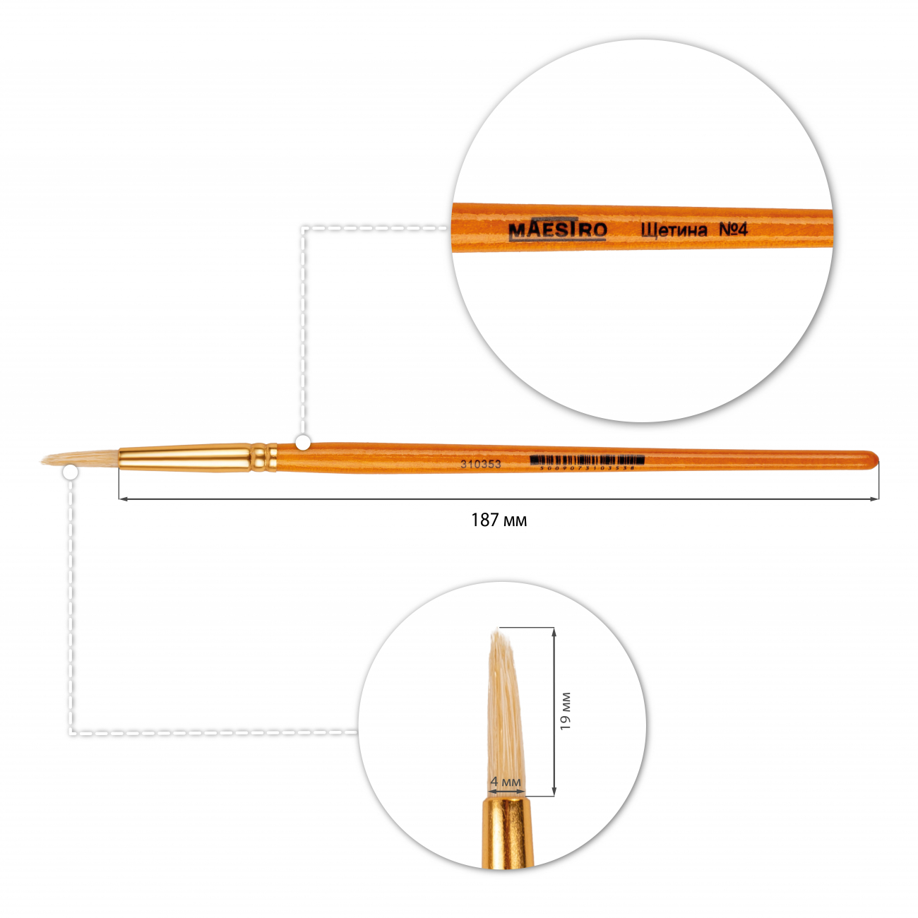 Кисть художественная «Maestro» щетина, круглая №4, 20см – это надежный инструмент для художественного творчества, позволяющий создавать чёткие линии и выразительные мазки.Она предназначена для работы с масляными, акриловыми и темперными красками. Круглая форма кисти обеспечивает точное нанесение краски и контроль над каждым мазком, а щетина удерживает краску и позволяет передавать насыщенность цвета.Преимущество кисти – в её прочности и долговечности: деревянная ручка удобна в использовании, алюминиевая обойма надежно фиксирует ворс, а щетина сохраняет форму даже при активном применении. Для длительного срока службы рекомендуется промывать кисть теплой водой после работы и хранить ворсом вверх.