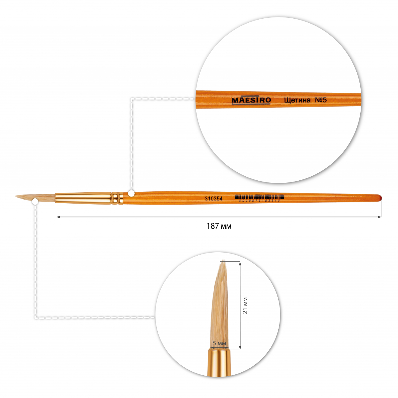 Кисть художественная «Maestro» щетина, круглая №5, 20см – это надежный инструмент для художественного творчества, позволяющий создавать точные и выразительные мазки.Она предназначена для работы с масляными, акриловыми и темперными красками. Круглая форма кисти обеспечивает контроль над краской и аккуратное нанесение линий, а щетина позволяет передавать насыщенность цвета и интенсивность мазков.Преимущество кисти – в её прочности и долговечности: деревянная ручка удобна в использовании, алюминиевая обойма надежно фиксирует ворс, а щетина сохраняет форму даже при активном применении. Для длительного срока службы рекомендуется промывать кисть теплой водой после работы и хранить ворсом вверх.