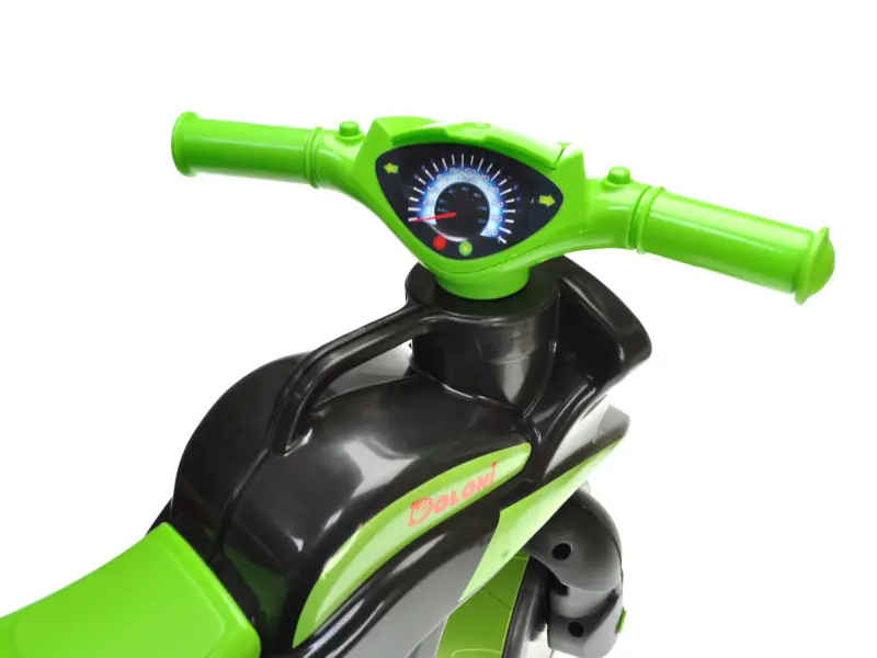 Стильный музыкальный беговел Doloni в черно-зеленом дизайне с логотипом «Doloni» сбоку подарит ребёнку море радости и активных игр. Световые эффекты и звук мотора с сиреной делают катание увлекательным, а колёса диаметром 20см обеспечивают лёгкое движение — достаточно просто оттолкнуться ножками. Во время игры ребёнок развивает все группы мышц, координацию и чувство равновесия. Широкие колёса делают байк устойчивым, а удобная ручка для переноски облегчает задачу родителям. Лёгкий, прочный и безопасный, он станет любимым транспортом малыша и подарит массу положительных эмоций.Характеристики: возраст – до 4 лет, максимальная нагрузка – до 30кг, колёса – d=20см, размеры – 70*37*50см, вес – 2,6кг, материал – пластик, световые и звуковые эффекты, питание – 2 батарейки АА (не входят).