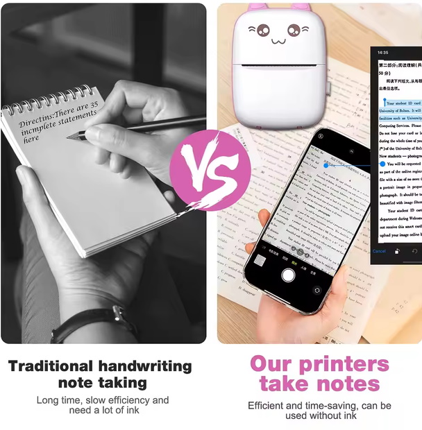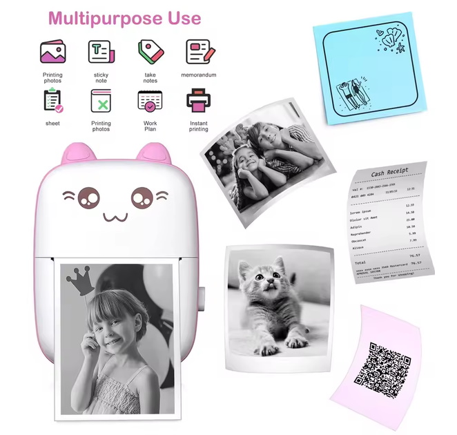 Портативный термопринтер Bluetooth с ушками и милой мордочкой котёнка — это компактный, стильный и невероятно удобный гаджет для повседневного использования. Мини-принтер позволяет быстро печатать заметки, напоминания, сообщения, чеки, скриншоты, фотографии, учебные материалы и любую графическую или текстовую информацию прямо со смартфона через Bluetooth-соединение. Благодаря своим миниатюрным размерам он легко помещается в карман куртки, рюкзак или небольшую сумку, поэтому его удобно брать с собой куда угодно.Устройство работает через фирменное приложение FunPrint, имеет простое подключение по Bluetooth 4.0 и поддерживает смартфоны на базе Android и iOS. Печать осуществляется по технологии термопечати без использования чернил, поэтому не нужно беспокоиться о картриджах — достаточно рулонной термобумаги шириной 56 мм. Перед печатью можно просмотреть изображение или текст на экране телефона, а история всех распечатанных материалов сохраняется в приложении. Меню приложения доступно на русском языке, что делает использование ещё более удобным.Принтер оснащён встроенным аккумулятором ёмкостью 1000 мА·ч, обеспечивающим автономную работу без постоянного подключения к сети. Печать выполняется в чёрно-белом цвете с плотностью 200 dpi, что гарантирует чёткое отображение текста и изображений. Милые кошачьи ушки и мордочка придают устройству особый шарм и делают его отличным подарком для детей, подростков и всех, кто любит полезные и стильные аксессуары.Такой принтер станет надёжным помощником в учёбе, работе, творчестве и повседневной жизни, сочетая в себе функциональность, портативность и милый дизайн.