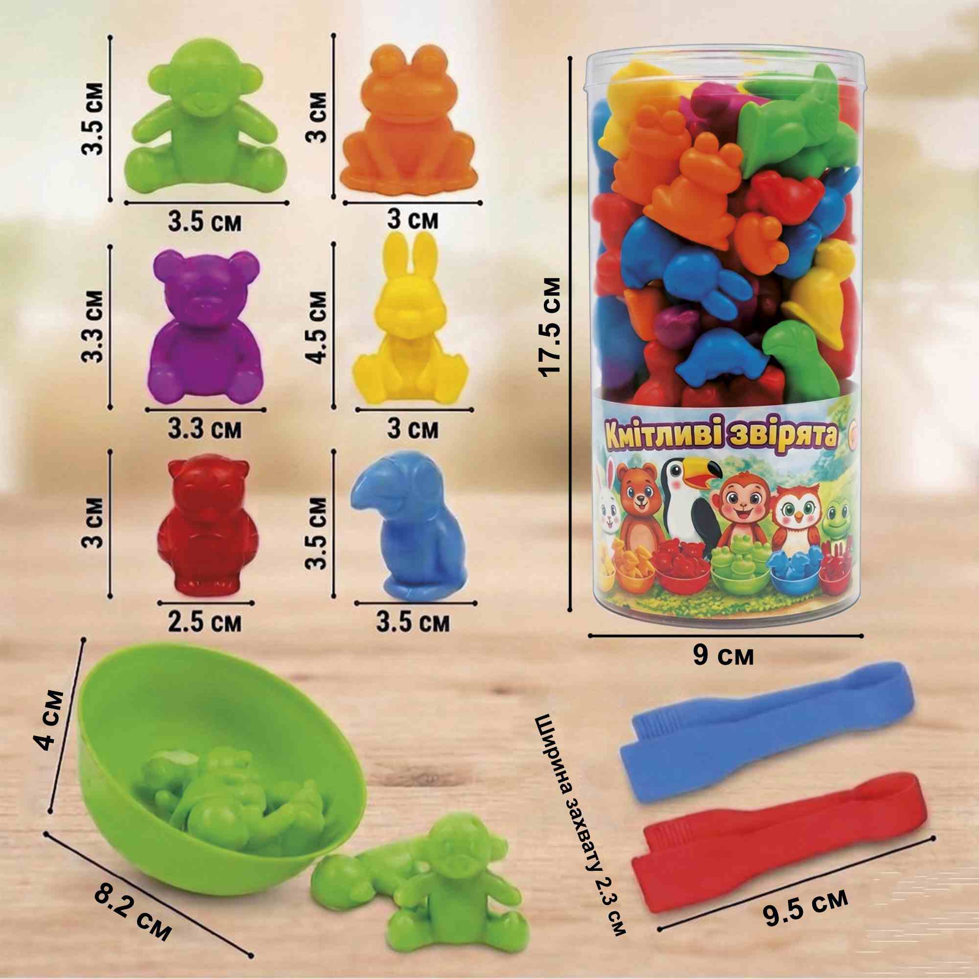 Гра розвиваюча "Кмітливі звірята" фігурки тварин 48шт (мавпочка, жабка, ведмедик, кролик, сова, тукан), щипці 2шт, кольорові піали 6шт, туба 17,5*9см, ТМ Enotik, Україна