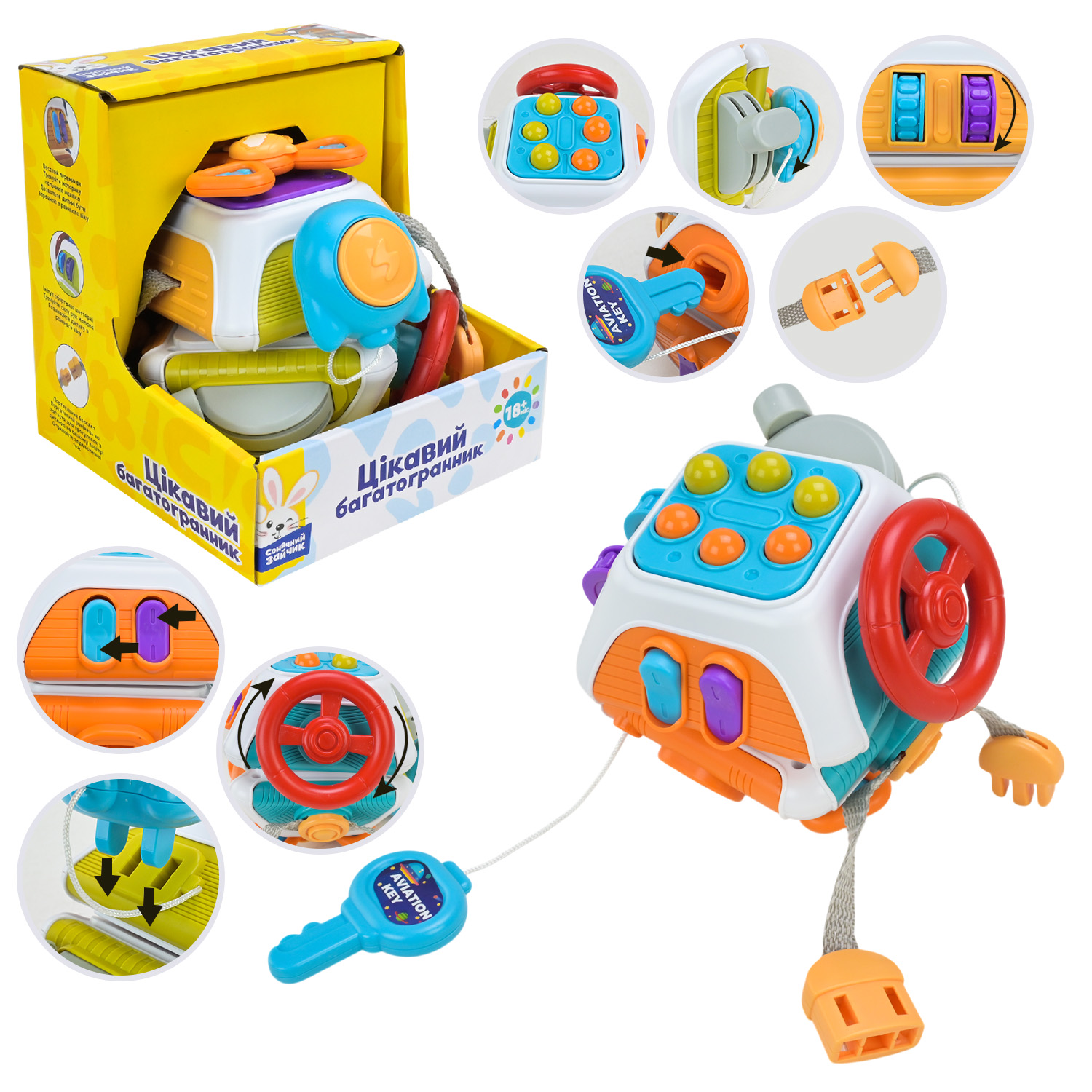 Брязкальце 11*11*8см, прорізувач, тріскачка, текстурні деталі, рухливі деталі, сенсорна гра, в кор. 11,5*11,5*8,5см (72шт)