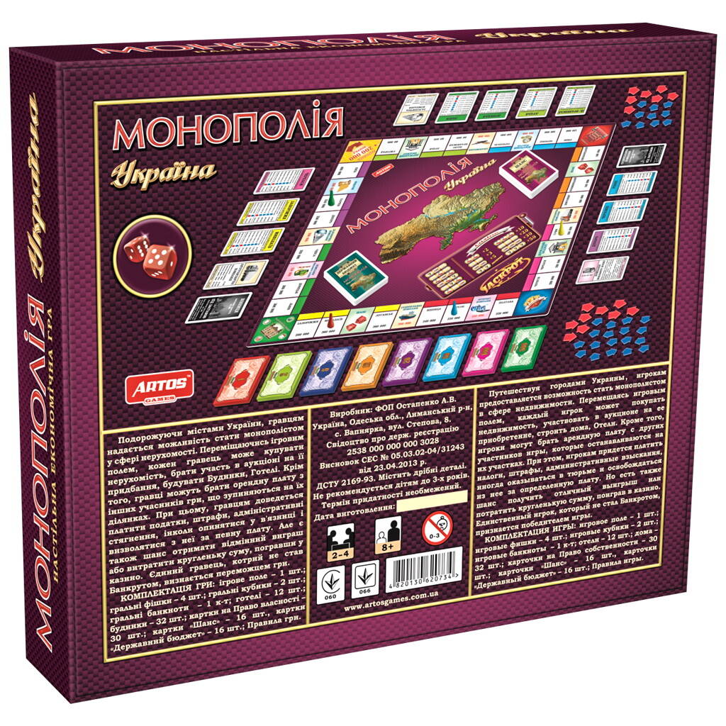 "Монополія" - настільна економічна гра,яка подарує море вражень і ігровий азарт. Подорожуючи містами України, гравцям надається можливість стати монополістом у сфері нерухомості. Переміщаючись ігровим полем, кожен гравець може купувати нерухомість, брати участь в аукціоні на її придбання, будувати будинки, готелі. Крім того, гравці можуть брати орендну плату з інших учасників гри, які зупиняються на їх ділянках. При цьому гравцям доведеться платити податки, штрафи, адміністративні стягнення, іноді опинятися у в'язниці і звільнятися від неї за певну плату. Але є шанс отримати відмінний виграш або витратити кругленьку суму, погравши в казино. Єдиний гравець, який не став банкрутом, оголошується переможцем.