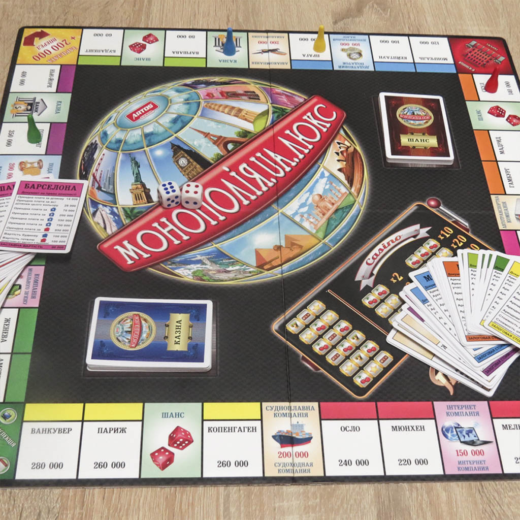 "Монополія люкс" - захоплююча настільна гра, яка ідеально підходить для сімейного проведення часу. Комплект доповнений класичним полем, всіма необхідними картками, гральними фішками, кубиками і ігровими грошима. Для гри учасникам надано весь світ, набуваючи і перебудовуючи найбільш знамениті міста світу. Гравці можуть змінити обличчя всієї землі, перетворивши її на власну корпорацію. В ході гри учасникам належить орендувати ласі шматочки країн, отримуючи прибуток з оренди, а також будувати житлові квартали і виробничі масиви. У набір входить ігрове поле у вигляді пазла, 4 гральні фішки, 2 кубики, комплект ігрових грошей, 12 підприємств, 32 будинки (картонні плоскі), 28 карток-документів на право власності, 16 карт громадська скарбниця, 16 карт Шанс, а також інструкція російською та українською мовами.