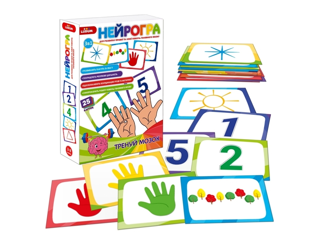 Розвиваюча гра «Нейрогра 3 в 1» від Ludum — це яскравий набір із 25 карток, який поєднує одразу три різні ігри для розвитку дітей. Завдяки простим і цікавим завданням дитина не лише весело проводить час, а й активно тренує пам’ять, увагу, мислення та дрібну моторику.У наборі є три напрямки гри:1.Кмітливі пальчики — картки з цифрами від 1 до 5 допомагають дитині навчитися рахувати, порівнювати кількість та відображати числа за допомогою пальців. Така вправа чудово тренує координацію рухів і логічне мислення.2. Кольорові долоньки — малюк вчиться відтворювати послідовності, повторюючи їх за схемою з карток. Це завдання розвиває увагу, пам'ять, вміння концентруватися та швидко реагувати.3. Таємні малюнки — картки із простими символами та фігурами (коло, сонце, хвиля, трикутник та інші) спонукають дитину малювати їх у повітрі чи на папері, тренуючи просторове мислення, уяву і підготовку руки до письма.Ігри зрозумілі навіть наймолодшим дітям, а до набору додається коротка інструкція та відеопояснення, які допоможуть освоїти правила дуже швидко.Переваги гри:1) підходить дітям від 3 до 8 років;2) розвиває обидві півкулі головного мозку;3) поєднує навчання та гру;4) стане в пригоді і батькам, і педагогам.Ludum "Нейрогра 3 в 1" — це компактний, яскравий і дуже корисний інструмент, який допомагає дітям з користю розважатися та гармонійно розвиватися.