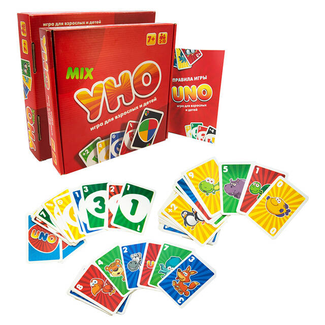Гра «УНО»-- динамічна, швидка, не має аналогів настільна гра, підійде для невеликої компанії, якій треба розвеселитися. Це всесвітньо відома настільна гра являє собою набір з барвистих карток, які потрібно позбутися якнайшвидше.Підступна «УНО» кожен хід підкидає спеціальні картки: «Кольори навпаки», «Замов колір» та інші. Кожна партія є непередбачуваною, кожен хід може закінчитися незворотними наслідками. Перемагає той щасливчик, який першим вийде з гри та крикне «Уно!».Кількість гравців: 2-10 осіб.