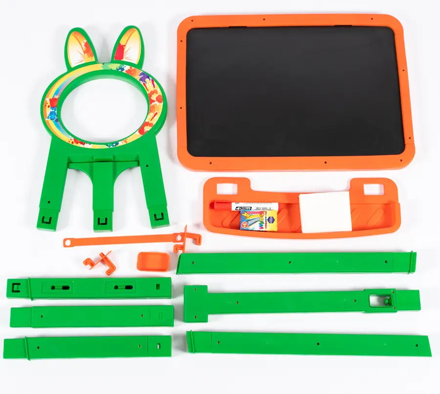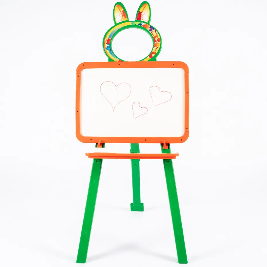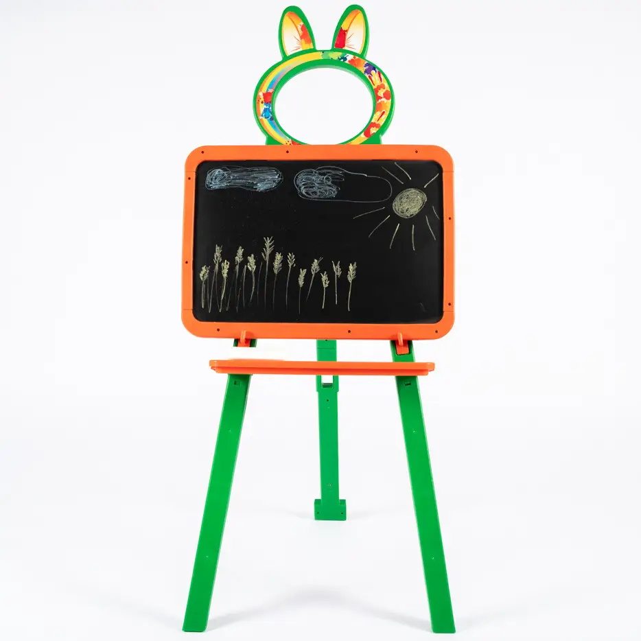 Дитячий мольберт 2 в 1 стане чудовим подарунком для юного художника та допоможе розкрити творчий потенціал дитини. Завдяки продуманій конструкції він легко розкладається, дозволяє регулювати висоту дошки на 52 або 62 см, а піддон для приладдя завжди знаходиться на зручному рівні – 46 см. У складеному вигляді мольберт займає мінімум місця, тому його зручно зберігати вдома.Мольберт має дві робочі поверхні: біла сторона призначена для малювання та письма спеціальними маркерами для дощок (не магнітна), а чорна сторона використовується для малювання крейдою і є магнітною – на ній можна розміщувати літери чи фігурки-магніти (не входять у комплект).У комплект входить 1 маркер для білої дошки, губка та набір крейди з 4 штук. Повна висота мольберта разом із вушками становить 117см, максимальна ширина – 47см, розмір дошки – 47*33см, а розмір робочого поля для малювання – 43*29 см.