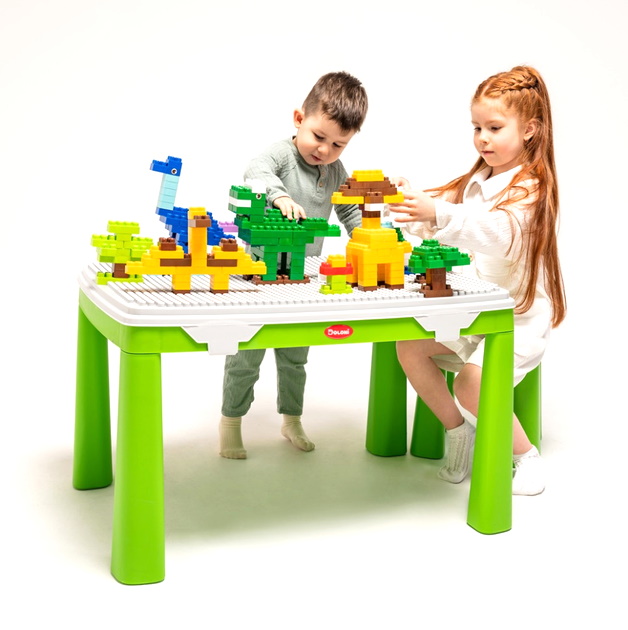 Цей універсальний комплект від Doloni поєднує зручність і розвиток у грі. У набір входить дитячий пластиковий стіл із повнорозмірною накладкою для конструктора та стілець, який легко трансформується у табурет завдяки знімній спинці та спеціальній заглушці. Поверхня столу повністю перетворюється на ігрову базу для кубиків, де дитина зможе створювати власні будівлі, дороги чи фантастичні світи.Особливу цінність комплекту додають два великі набори конструктора (по 397 деталей у контейнері для зберігання), які відкривають безмежні можливості для творчості та розвитку дрібної моторики. Усе це упаковано в красиву подарункову коробку, що робить набір ідеальним презентом для будь-якої дитини.Вироби Doloni відомі своєю міцністю та безпечністю: стільчик витримує вагу навіть дорослої людини, а пластик сертифікований і не містить шкідливих домішок. Столик можна використовувати не лише для гри, а й для навчання чи маленьких чаювань.Розміри столу: 82*56*48см.Розміри стільця: 30*30см, висота сидіння — 30см, загальна висота зі спинкою — 60см.