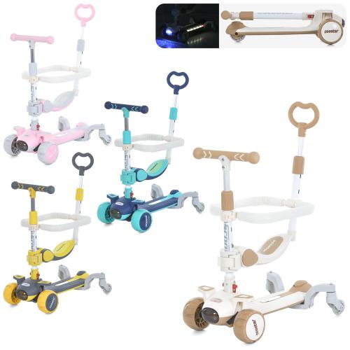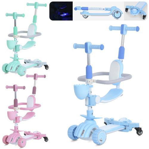 Самокат 5в1 (беговел), металл+пластик, род.ручка-3положение, 3 колесаПУ,2 пер.110мм св, задн 85мм, св, подножка 26*12см-музыка, свет, руль 4 положения (1положение 69см, max 81,5см ), доп.колеса 65мм, накладка на сиденье, ремни безопасности, 3цвета, (6шт)