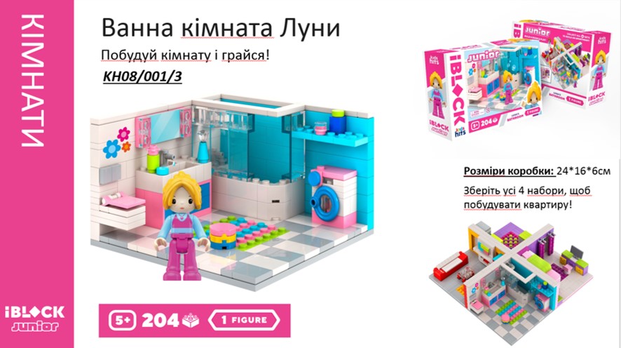 Конструктор Kids hits IBLOCK JUNIOR Девочки, Ванная комната Луны, 204 дет, компл. фигур, инстр., наклейки, в кор. 24*16*6см (36шт/2)