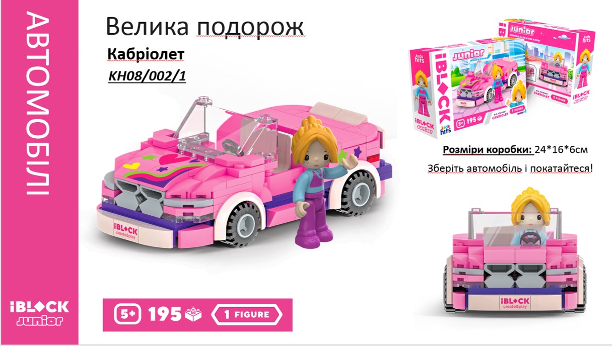 Конструктор Kids hits IBLOCK JUNIOR Девочки, Кабриолет Большое путешествие, 195 дет, компл. фигур, инстр., наклейки, в кор. 24*16*6см (36шт/2)