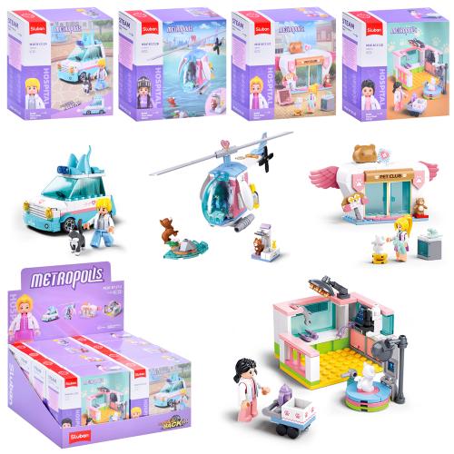 Конструктор SLUBAN ЦЕНА ЗА 1ШТ розовая серия, 4 вида (2-транспорт, 2-комната), фигурка, животное, от78дет, 8шт в дисплее, 30*15,5*25,5см (96шт)