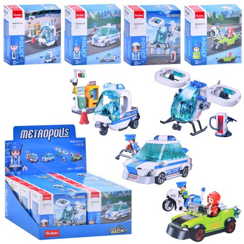 Конструктор SLUBAN ЦЕНА ЗА 1ШТ полиция, транспорт, от 97дет, 4 вида, в кор. 8шт в дисплее, 30*15,5*25,5см (96шт)