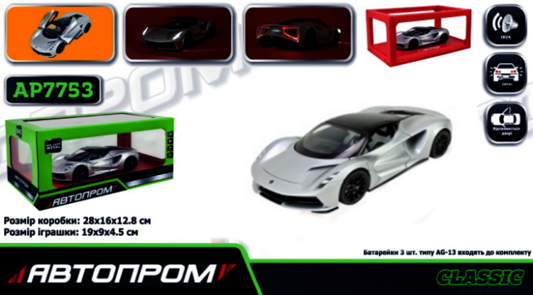 Машина мет. АВТОПРОМ 1:24, 3 цвета, бат, мир., звук, дверь откр., в корр. 29*16,3*14,3см (12шт)