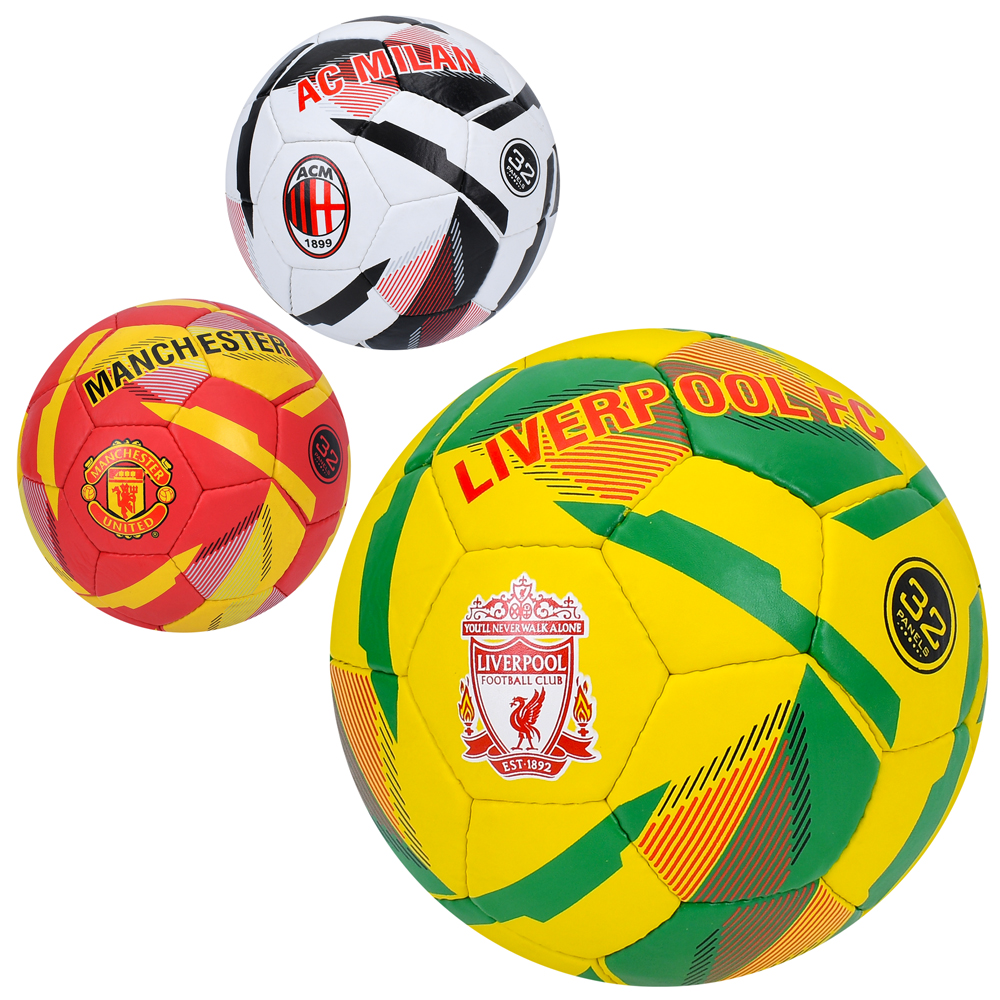 Мяч футбольный, размер 5, ПУ1,4мм, 32 панели, ручная работа, 420-400 г, 3 вида (клубы), в пак. (30шт)
