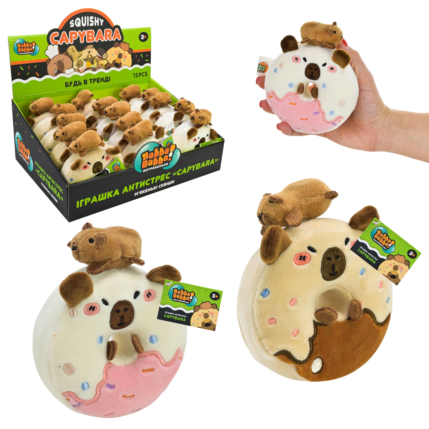 Антистресс YabbaDabba Капибара сквиш пончики ЦЕНА ЗА 1ШТ, В УП. 15ШТ дисплей бокс 32*23*13см (120шт)