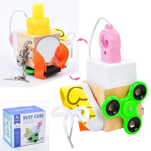 Бизикуб 6в1, 20*12*12см, шнуровка, спинер, замок+ключ, вилка+розетка, застежка, болт, зеркало, в кор. 15*13,5*11см (20шт)