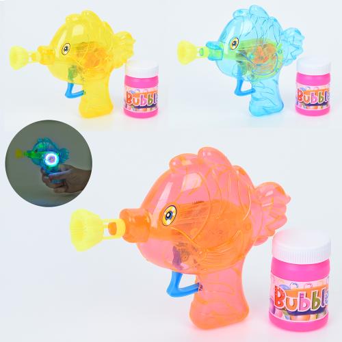 Мыльные пузыри пистолет-рыбка, 14см, свет, запаска 6см, 3 цвета, бат(табл), пак. 17,5*19*4см (100шт)