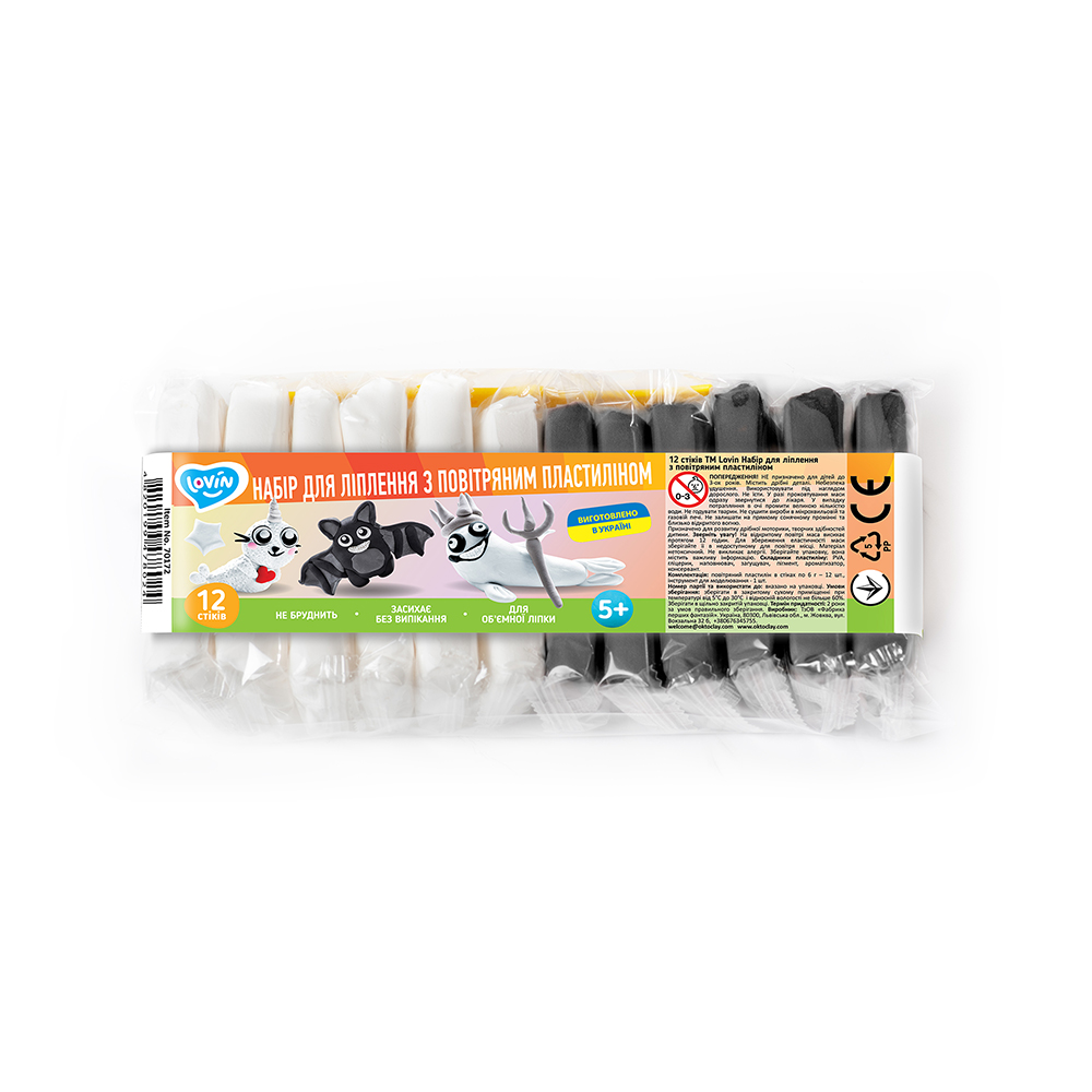 Набор для лепки с воздушным пластилином, 12 черно-белых стиков, пак. 19*8*3см, ТМ Lovin (40шт)