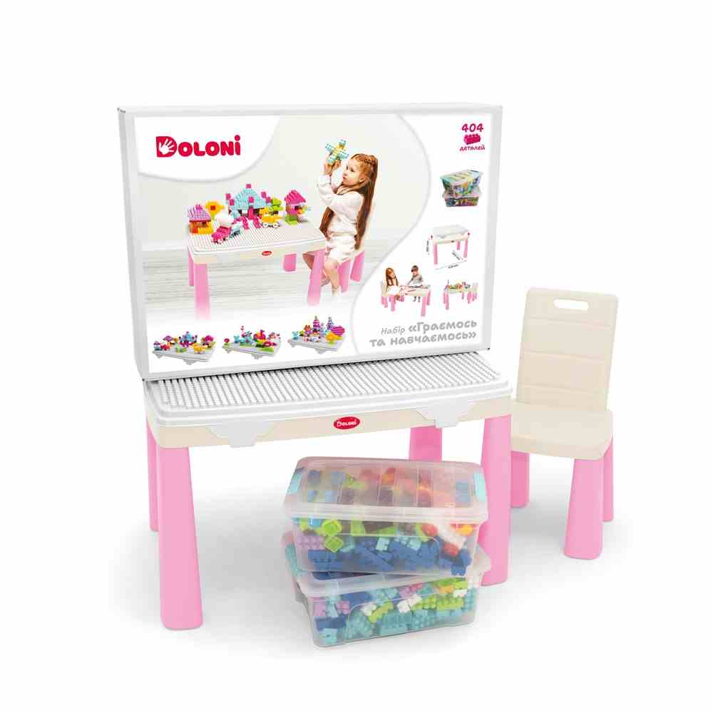 Набор "Играем и учимся" (в наборе стол, стул, конструктор Набор для девочек 404 деталей в контейнере для хранения), в кор. 85*60*22см, ТМ Долони, Украина