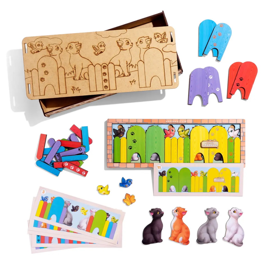 Деревянная игра с карточками "Кошки за забором", планш. 16*23*5см, ТМ UBumblebees, Украина