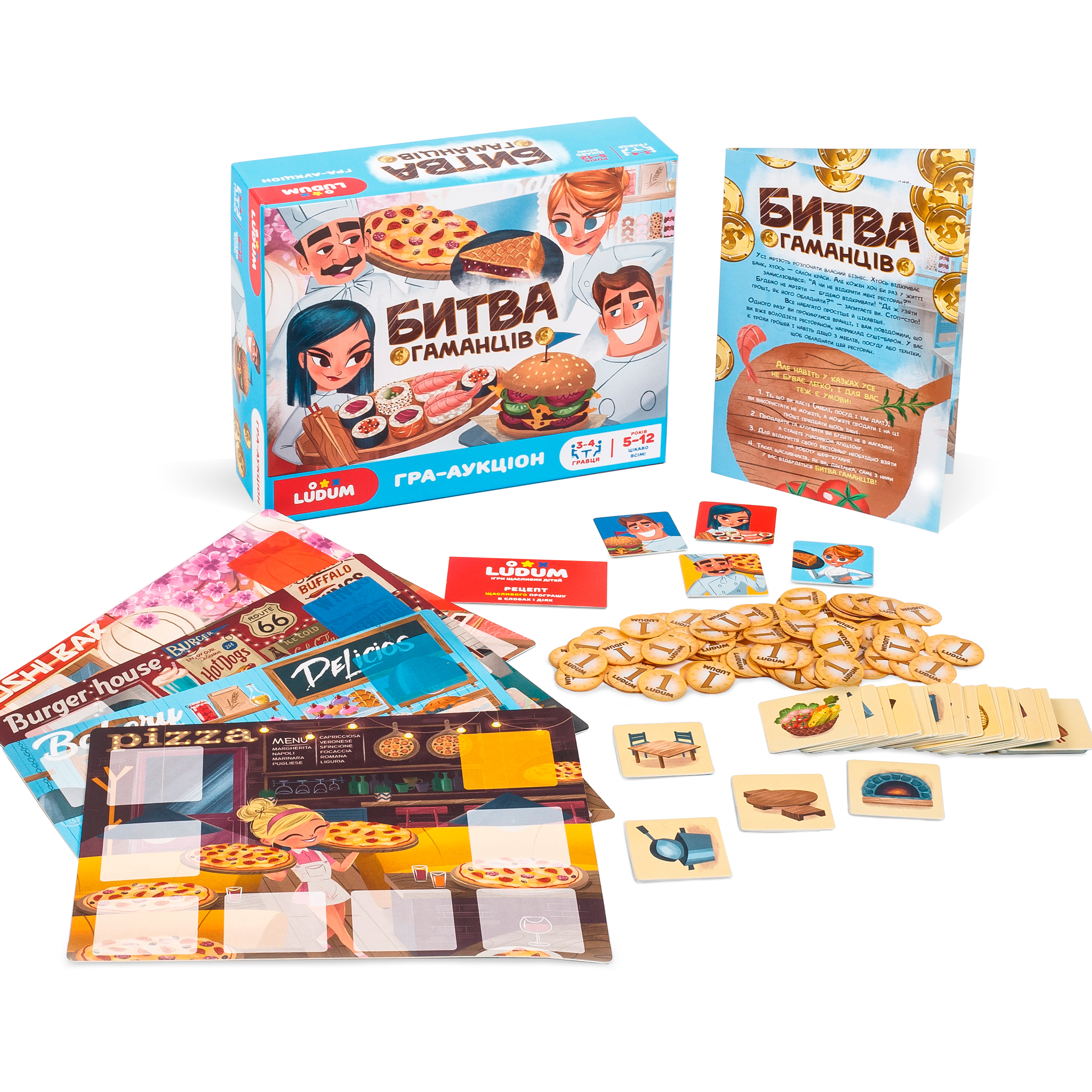 4 поля-ресторана, 4 карточки с изображением поваров, 37 карточек с оборудованием, 80 монет, инструкция