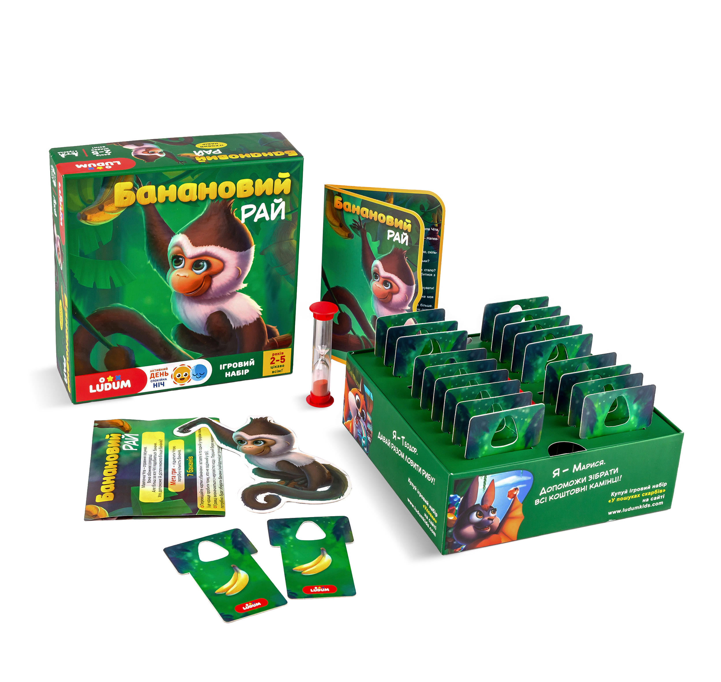 Ложемент, двусторонние карточки с изображением бананов 20шт., фигурка обезьянки, открытка с рассказом, песочные часы, инструкция, ссылки на аудиосказки