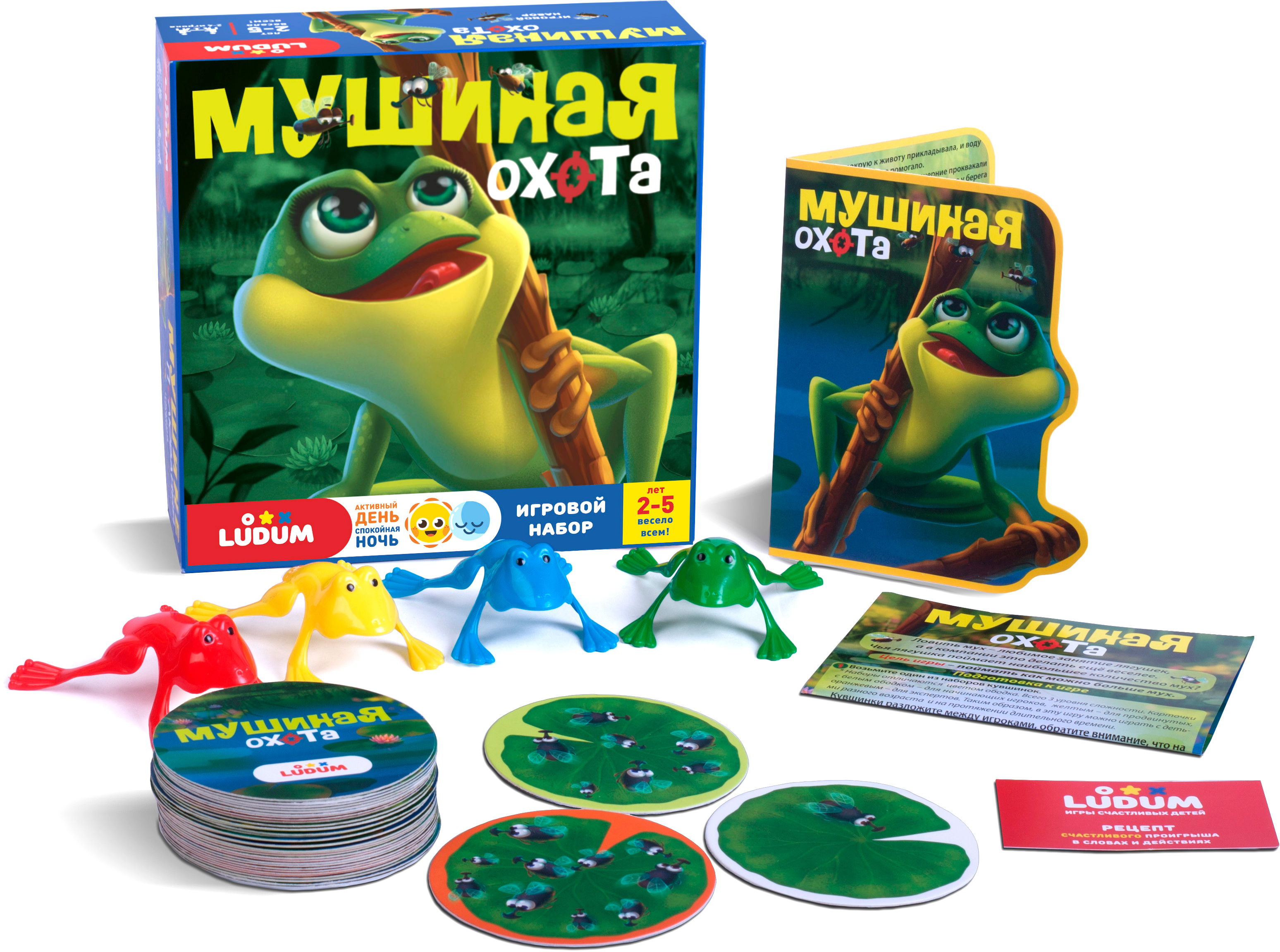 Игровые карточки-листочки с изображением мух - 36 шт. «Прыгающие» лягушки - 4 шт. Открытка с рассказом. Инструкция. Ссылки на аудиосказки.