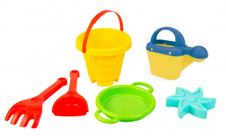 Песочный набор (лейка, сито, ремень, грабли, лопатка), в сет. 27*15см. ТМ KINDER WAY, Украина (10шт/уп)