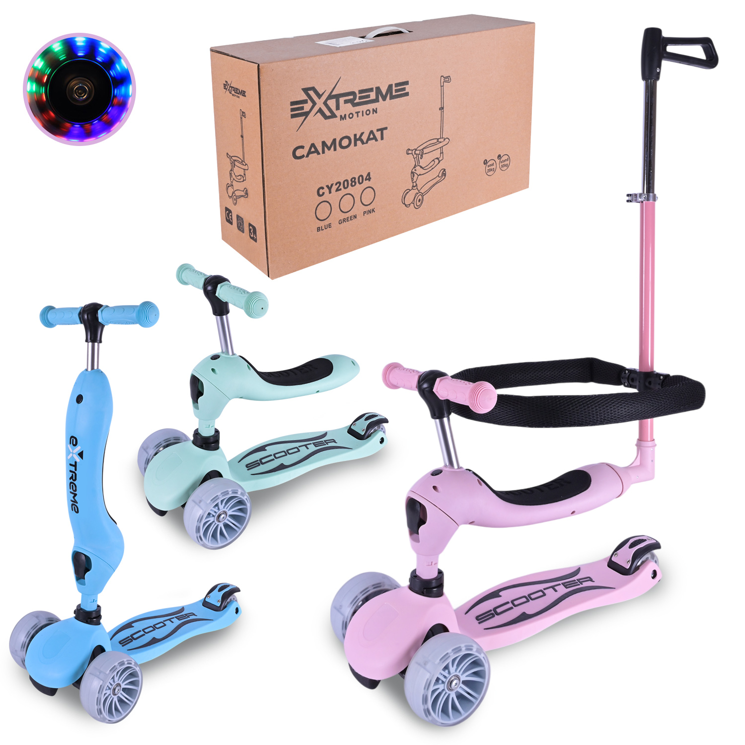 Самокат 5в1 (беговел), металл+пластик, род.ручка-3положение, 3 колесаПУ,2 пер.110мм св, задн 85мм, св, подножка 26*12см-музыка, свет, руль 4 положения (1положение 69см, max 81,5см ), доп.колеса 65мм, накладка на сиденье, ремни безопасности, 3цвета, (6шт)