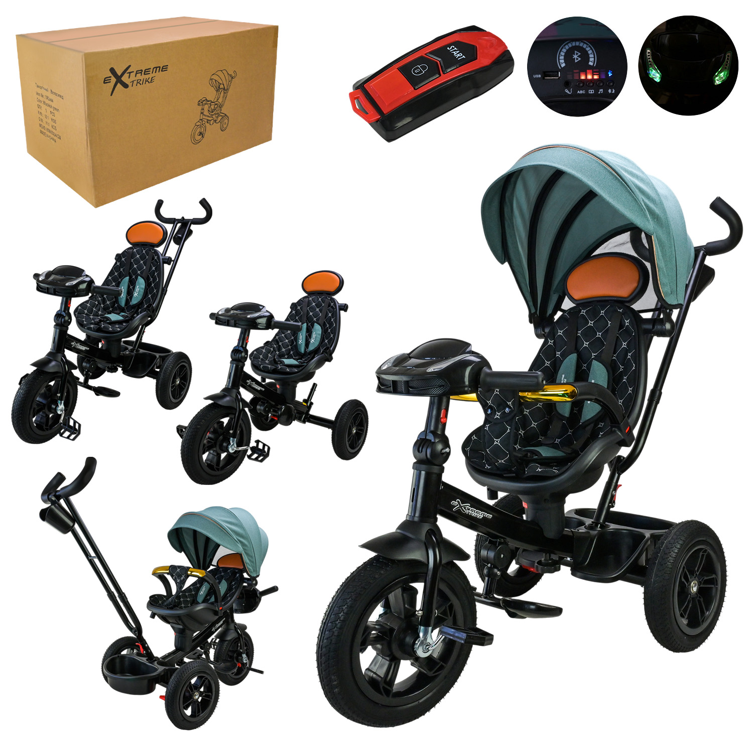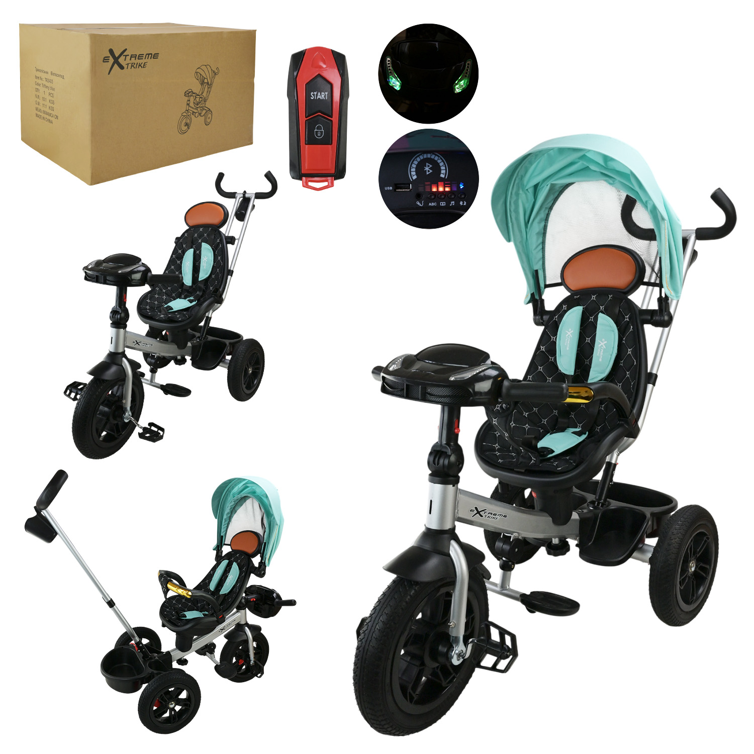 Велосипед 3-х колесный резиновые колеса 12'' и 10'' с тормозом, пультом bluetooth подключения, бат., звук, свет, с родительской ручкой и крышей, в кор. 60*40*34см (1шт)